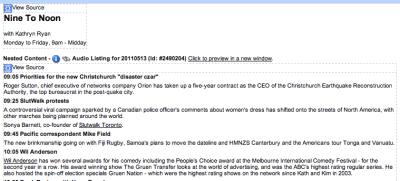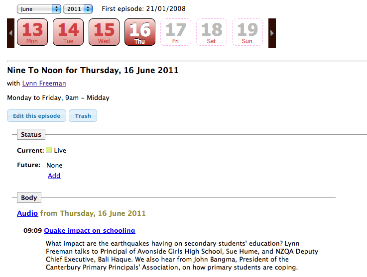 In addition to the native clean-up, I have added an additional formatting function for the body. This takes the body content, sending it back to the server to be pre-formatted by ELF’s built in parser/formatter. The parser takes the input HTML and returns content formatted in a standard way (bold for lines that start with time). A future version will add links when RNZ programmes are mentioned in the heading.