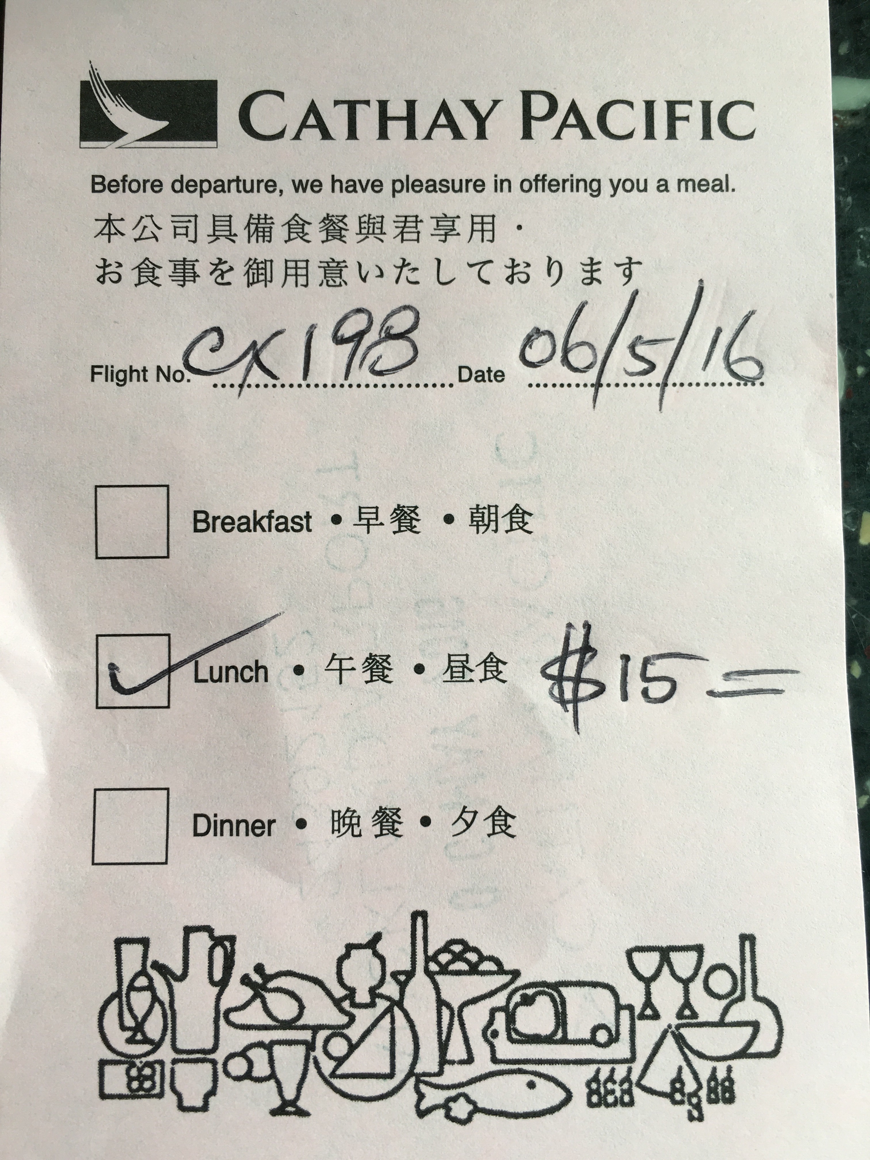 The flight’s been delayed 90 minutes, but very nice to get a couple of lunch vouchers. So, to lunch on the ground in a swanky Auckland International Airport Cafe, and then we embark on the first stage of our journey. First stop, Hong Kong.