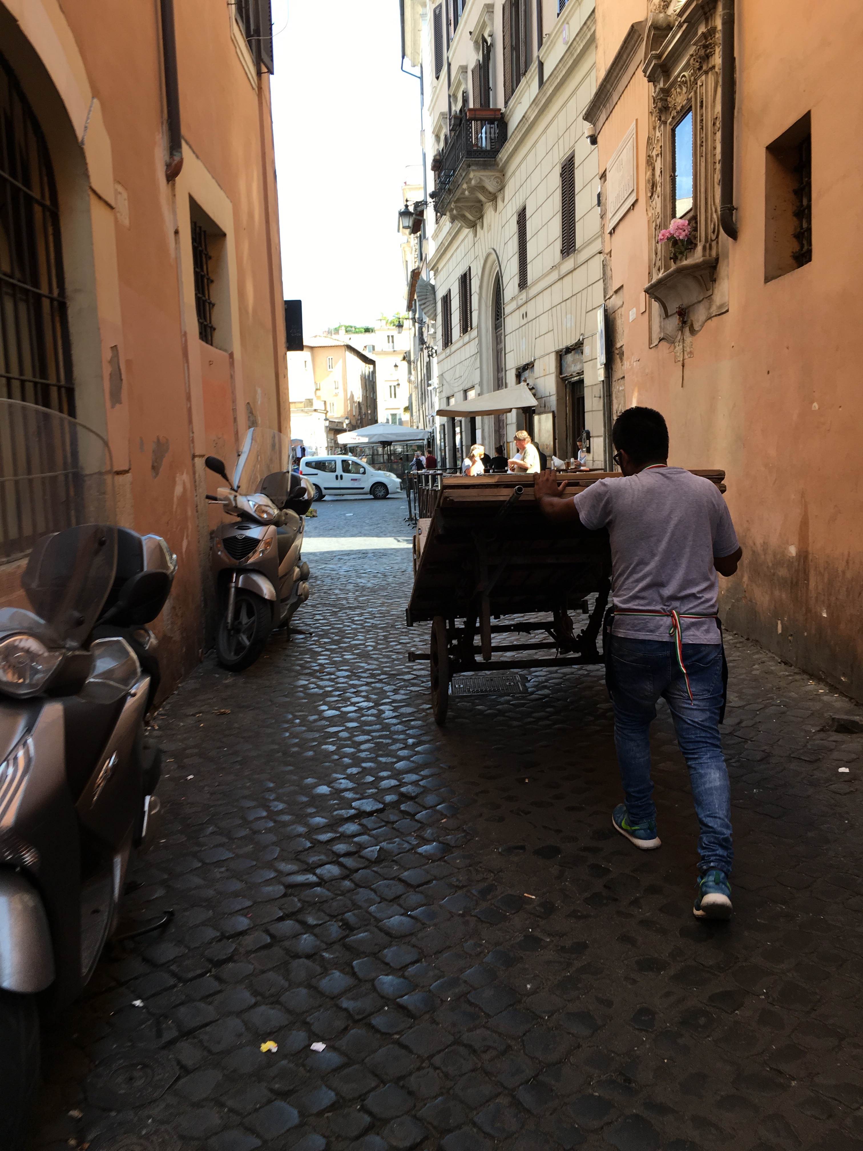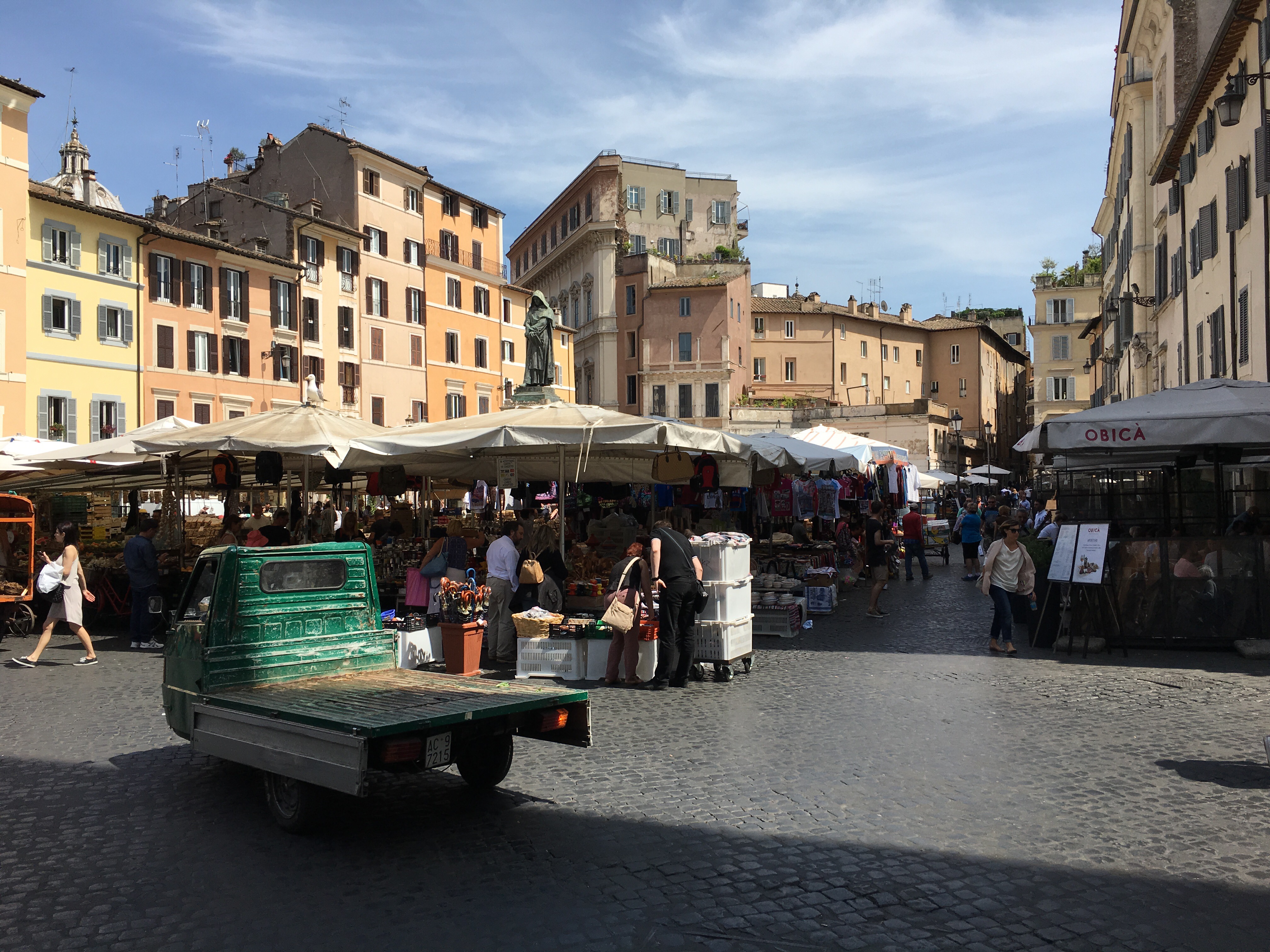 We are now encamped in Campo de’ Fiori. One minute walk away from our apartment is a large open-air market, filled with a diverse range of goods from touristy items like postcards, and key rings to produce and clothing.