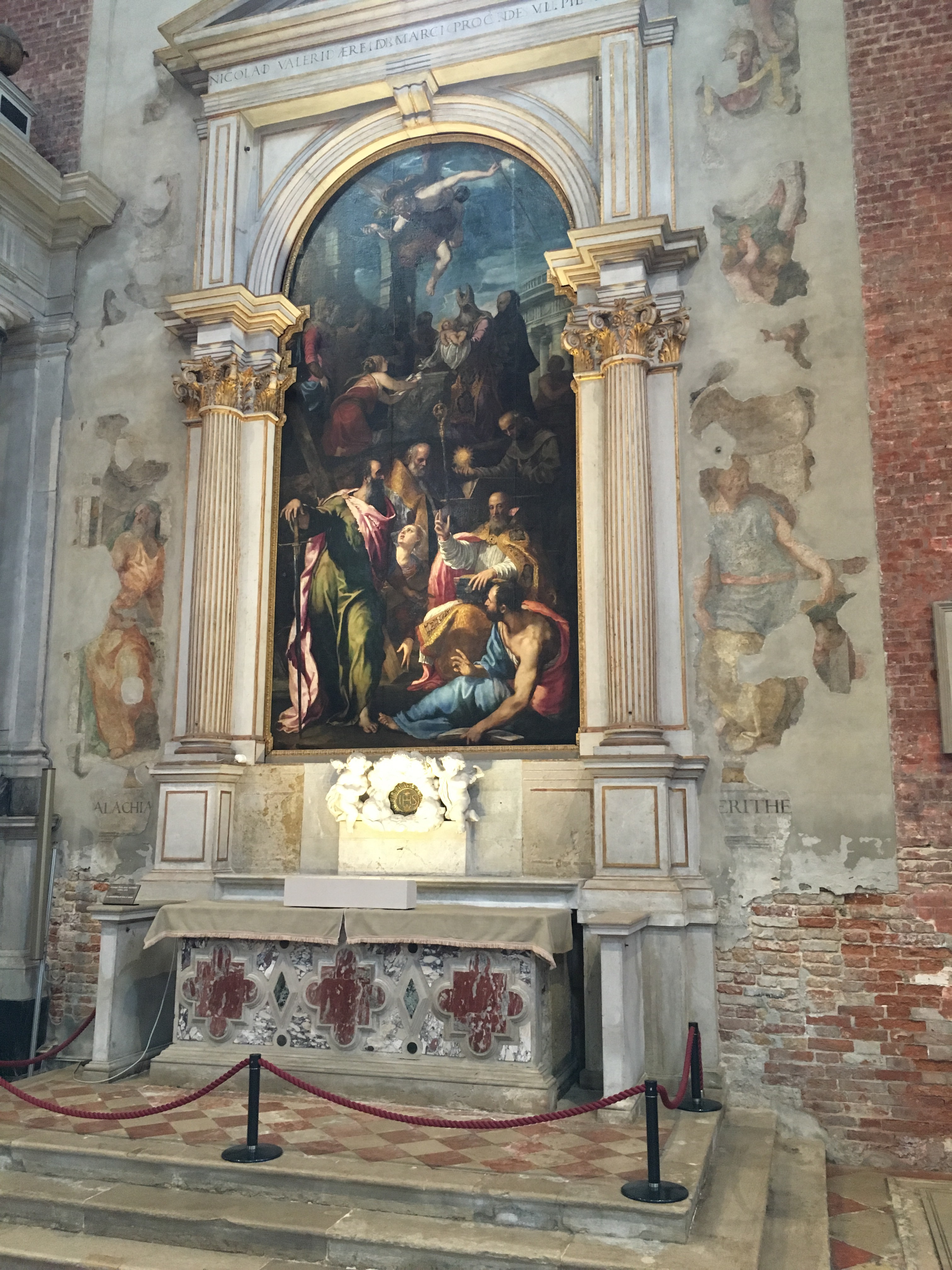 Compare this section of unrestored wall from the Basilica di Santa Maria Gloriosa dei Frari in Venice with the restored section around the (also restored) painting in the picture underneath.