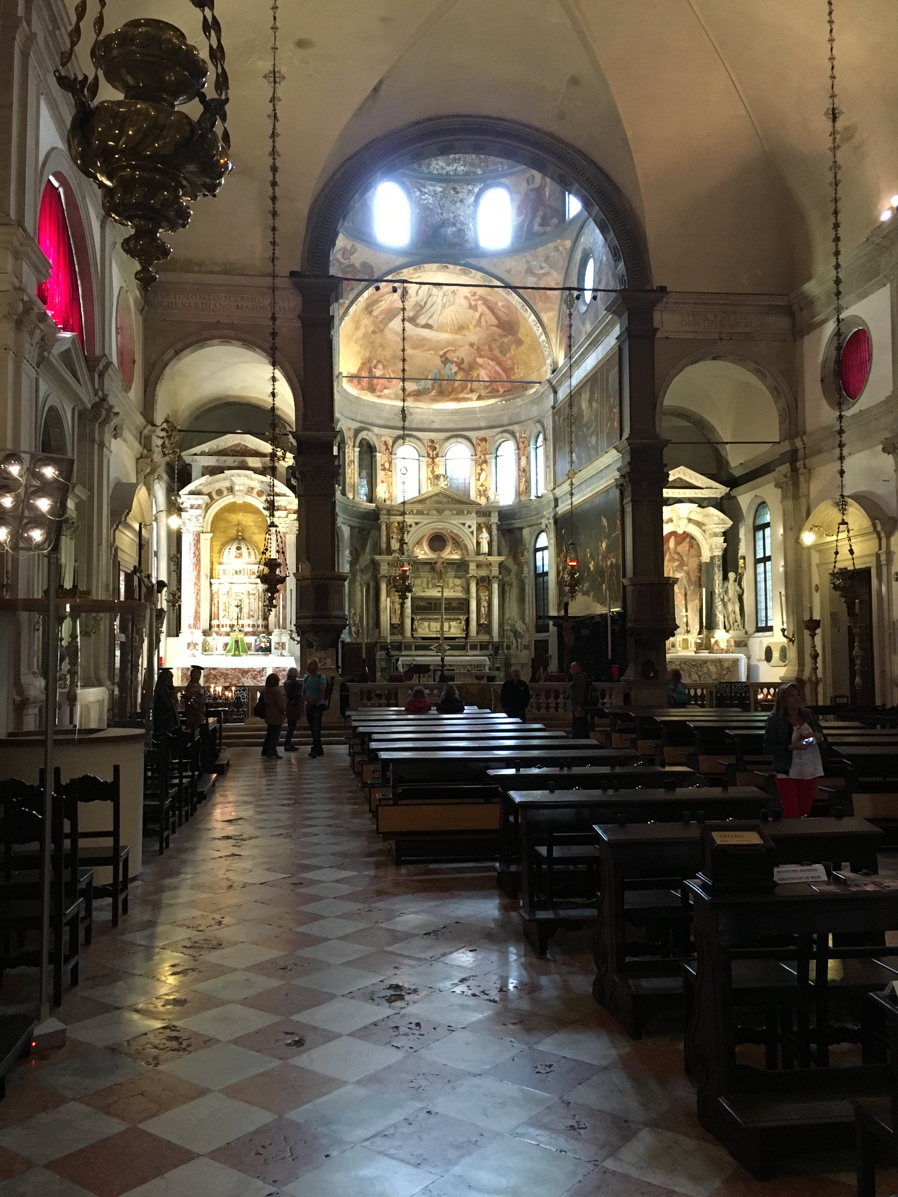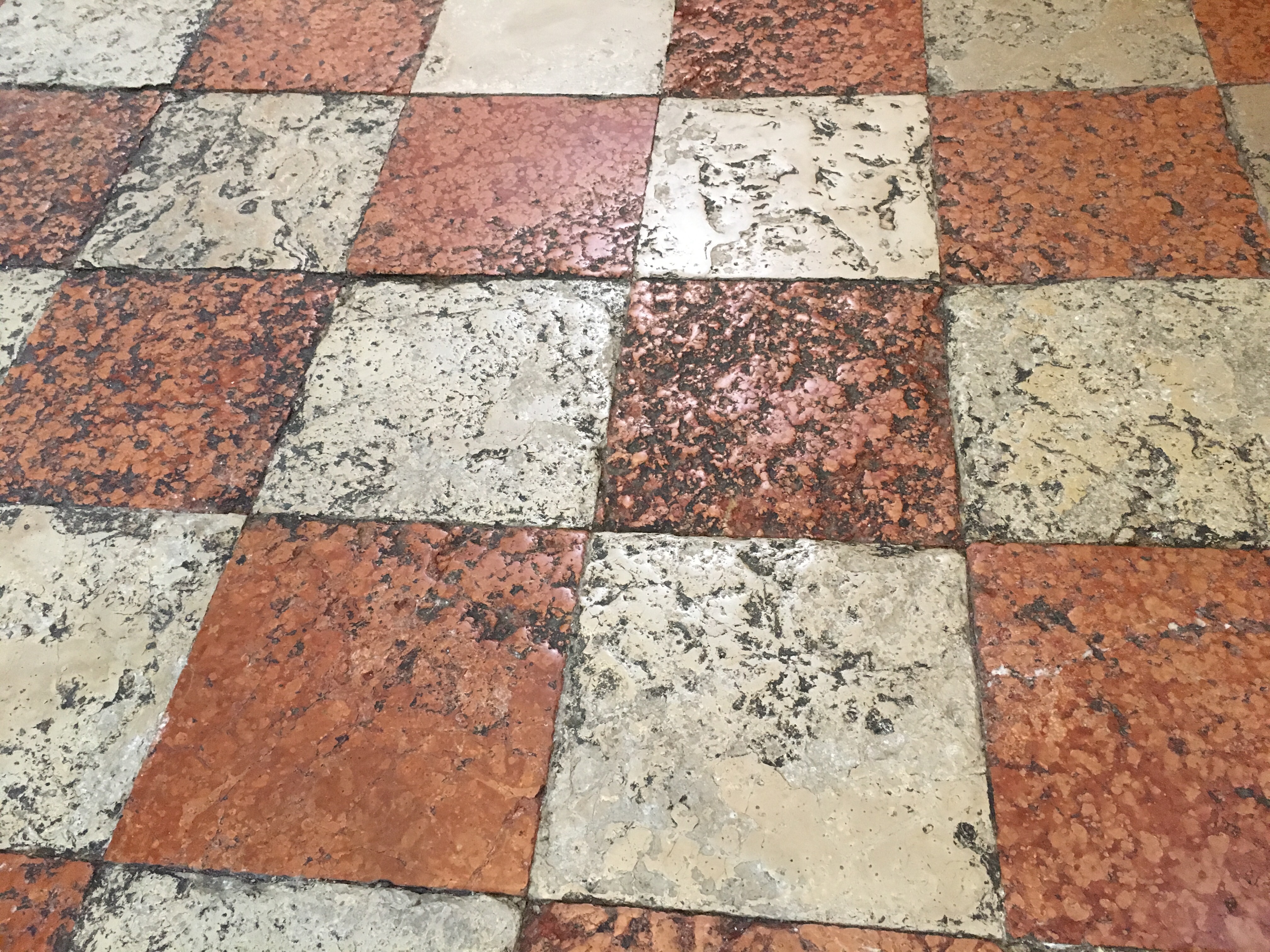The floor is red and white marble, some sections of which are worn from centuries of use.