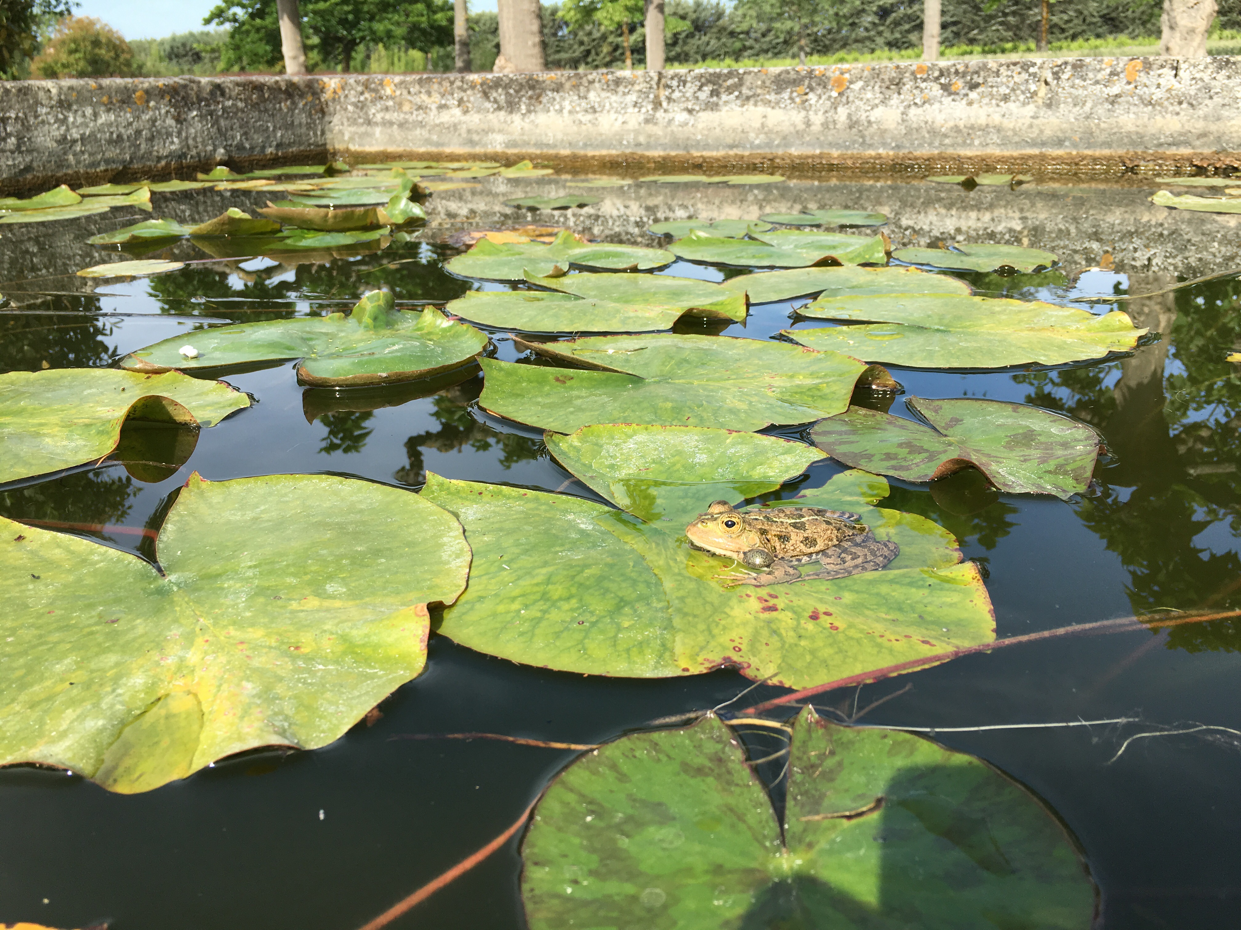 Behind the building is old pond with fish and frogs. Here is one sitting on a lilly pad.