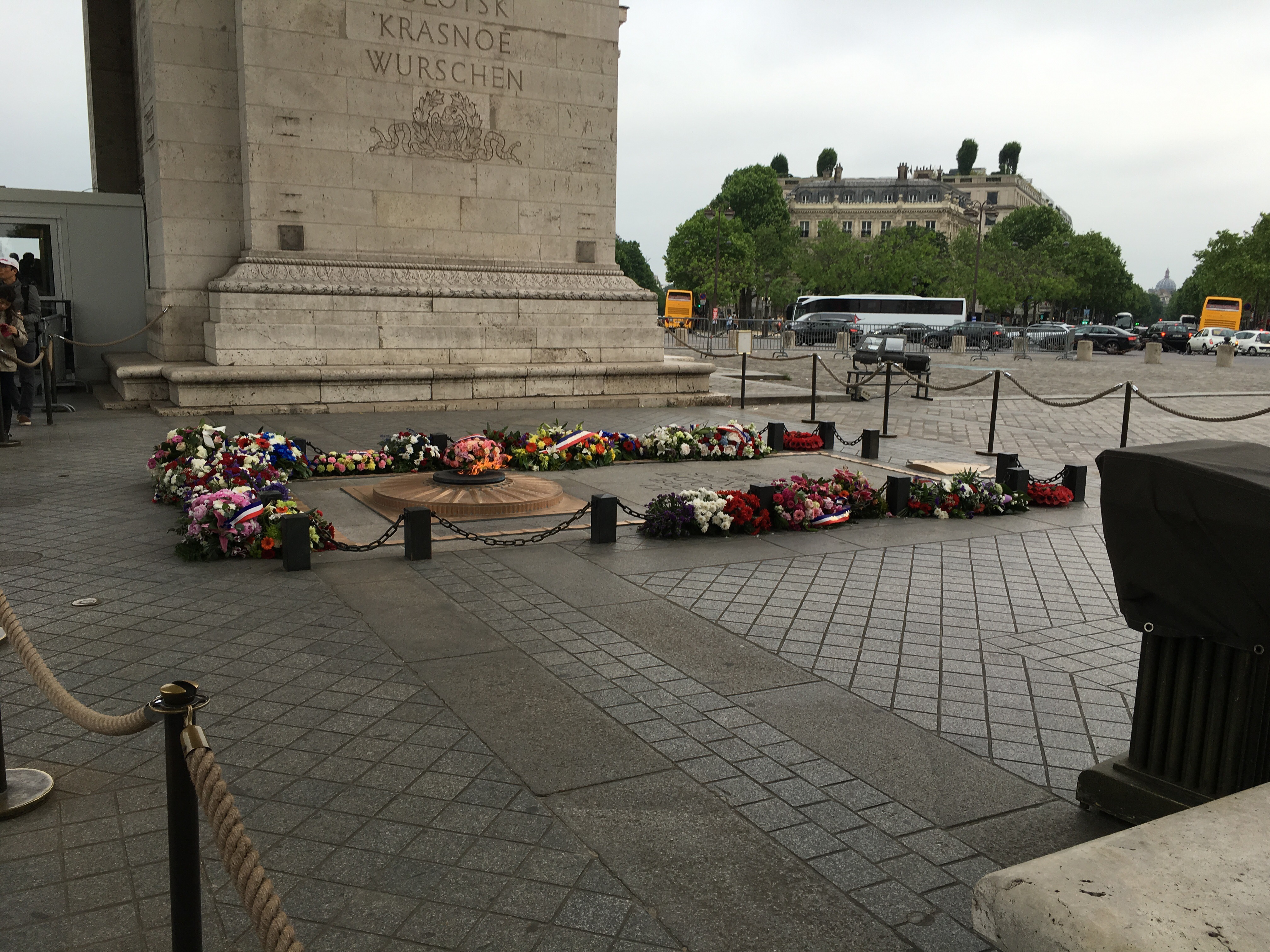 We visited the Arc de Triomphe during a commemoration ceremony. I was not able to find out what it was for, but they have the French flag flying in the Arc and a flame burning.