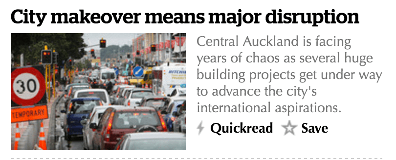 In regard to accessibility, the image and the overlay link are hidden from screen readers. In the case of the image, these don’t add any value to someone visiting the page with a screen reader. The same goes for the second (overlay) link in the block. Hiding both of these from screen readers reduces the ‘noise’ caused by items that are irrelevant in the context of getting a summary of new stories. We tested this when I was at RNZ, and the screen reader reader community loved this feature, and given that the CMS generates the markup automatically why wouldn’t you do it?